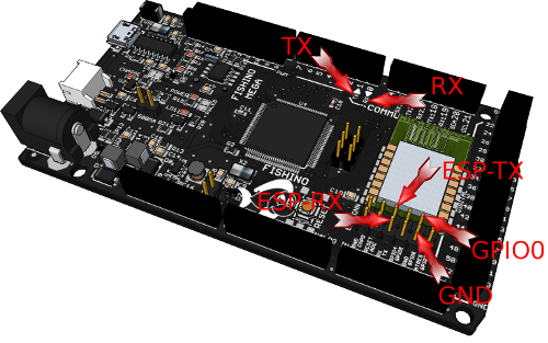 - Connettere la porta TX di Fishino con la porta ESP-TX sul connettore ESP, e la porta RX di Fishino con la porta ESP-RX sul connettore ESP (vedere figura)